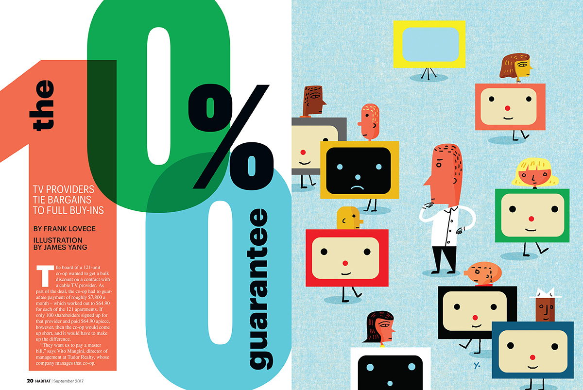 Habitat Magazine has turned into a fun client. AD Chad Townsend called with cover and feature about the rule many cable companies have requiring everyone in the building subscribe to cable service in order to have cable service wired into buildings. An idea of “counting” who is on board seemed like a fun way to catch the idea. It was a nice surprise to see how Chad designed the spread.