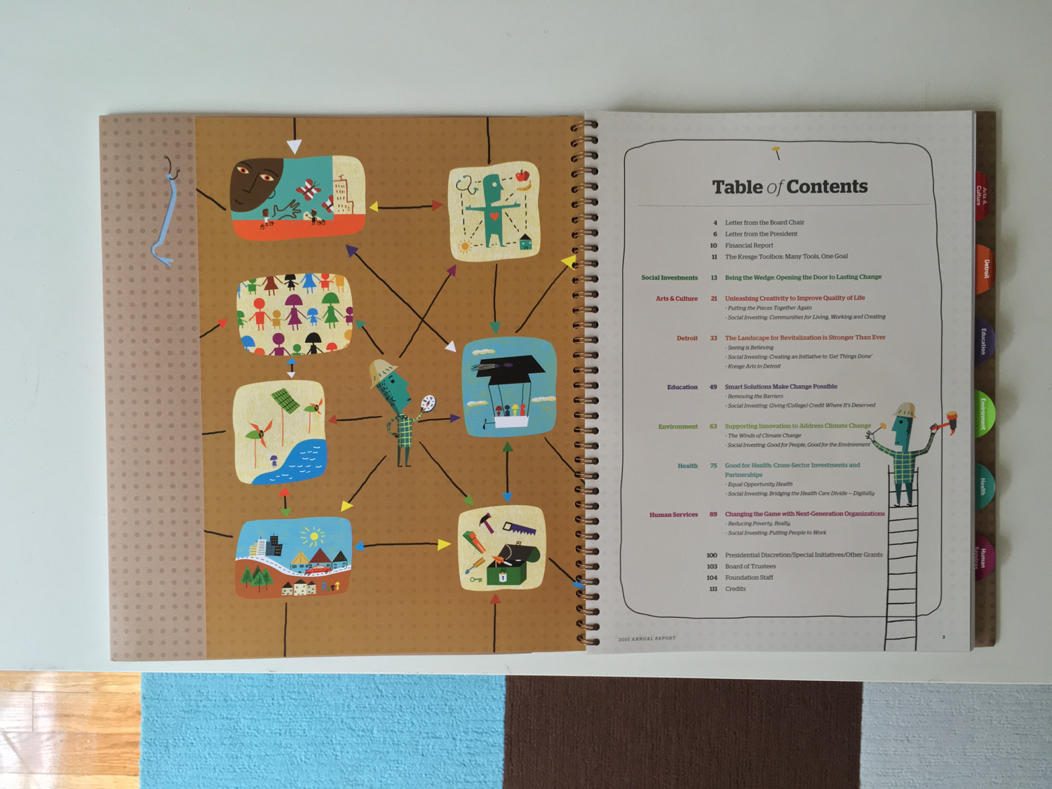 Hour Media has been a long time client and it’s been a thrill to see them grow along with the resurgence in Detroit. When AD Ken Cendrowski called with an annual report for the Kresge Foundation it was a pleasant surprise. The client and the design team wanted the metaphor of tools to represent their broad scope of support and the process was very collaborative. Ken created a pegboard pattern and it was my job to create characters and tools which would work with the pegboard. Also included was a table of contents section with elements and vignettes which could be used throughout the report. Kresge turned out to be a great client during the process. Most satisfying of all was the enthusiastic feedback from Kresge and their clients. Much thanks to Ken for an engaging project and process.