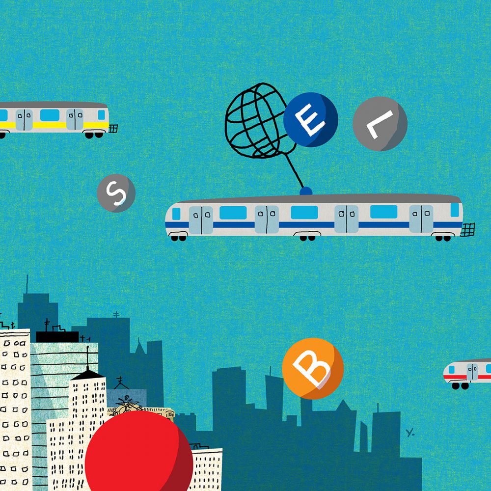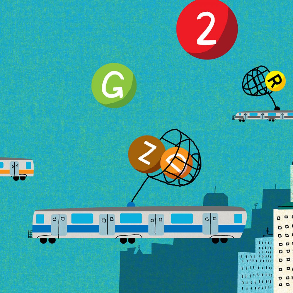 There are projects on my bucket list and much to my delight Amy Hausmann who runs the wonderful subway art card program for the Metropolitan Transit Authority asked for a poster which would appear in subways cars on the MTA system in 2017. Amy wanted an image based on my experience riding subways and encouraged letting the imagination run free. My main goal was to create an escape for the rider so cars flying in a Jetson-like manner around the city while catching the “lines” struck as a perfect idea. Every New Yorker knows the colorful circular icons for the lines and since I am a color guy it was the perfect element for play. I was hoping floating balls would create a momentary sense of calm or zen during a commute. Ann and the team at MTA arts were very supportive and it was one of the most enjoyable collaborative processes I’ve had in my career. Much thanks to Amy and the team for the opportunity to feel like a part of the city.