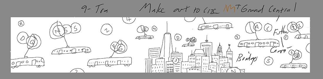 This is work in progress which was shared with Amy and the team so they could have a feel for the texture. The color shifted more towards blue in the final. Amy asked about extending the cityscape and I thought it was a great idea. One day while riding the PATH New Jersey train, the view of the city from the train hit me with the solution for extending the skyline. The main goal was to extend the cityscape while not making the image cluttered.