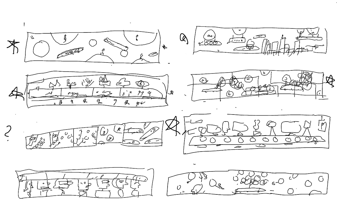 The first round are quick brainstorming sketches which are broken down to basic shapes to see if they can work compositionally. Since they are only for me, the drawings are very illegible. Starred ideas are developed further.