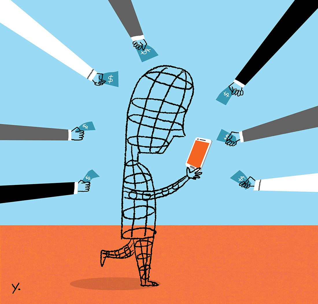 Illustration for the New York Times Dealbook section: It’s time to tax companies for using our personal data. Corinne Myller, AD. Dealbook is one of my favorite sections and Corinne Myller is one of my favorite art directors. The orange is used as a metaphor for how our interactions on the web have become hot property.
