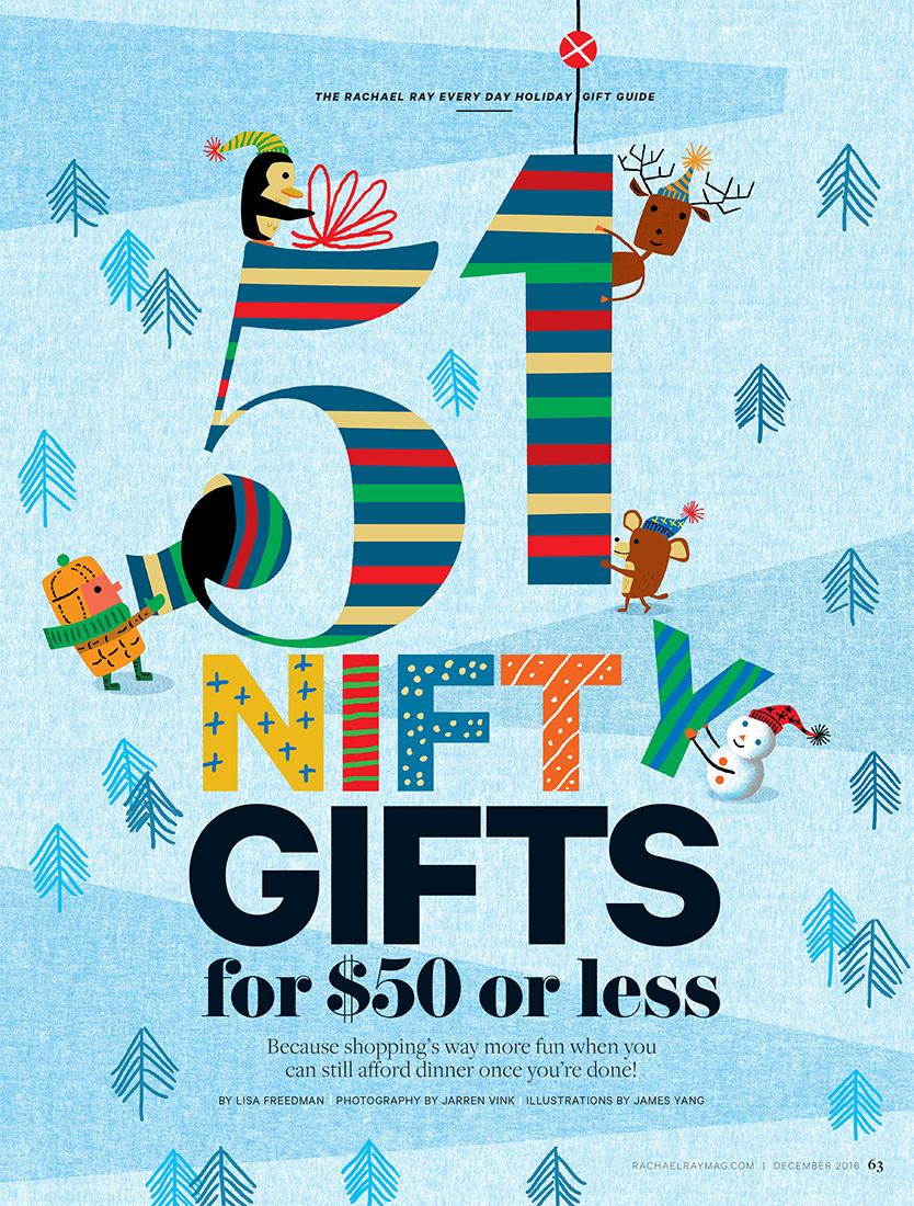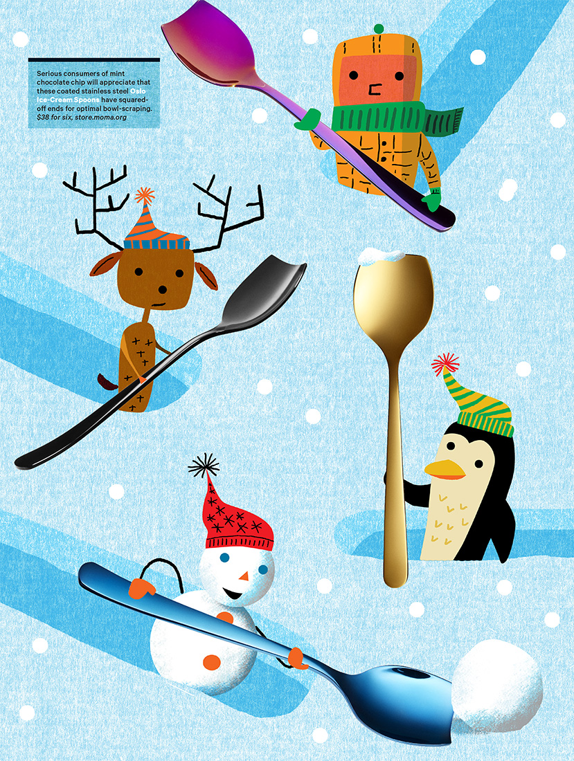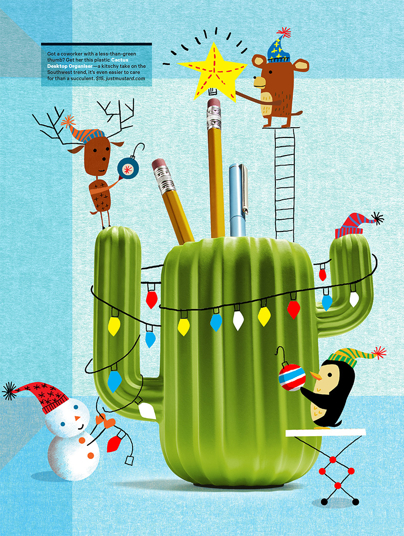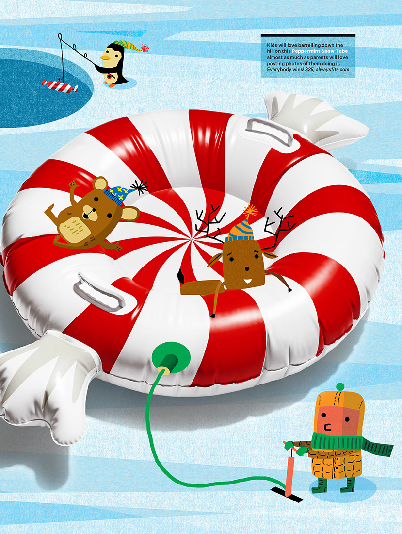 Art Director Phoebe Flynn Rich has been a long time friend and it was a pleasant surprise when she called with a project for Rachael Ray’s Holiday Gift Guide. She wanted illustrations which incorporated gifts a photographer shot products based on sketches for various sections. The main idea was a winter cast of characters in various holiday settings. This was a new experience using illustration with photos and it was a relief when it worked out even better as planned. I owe Phoebe a drink for pushing my work in a new direction.