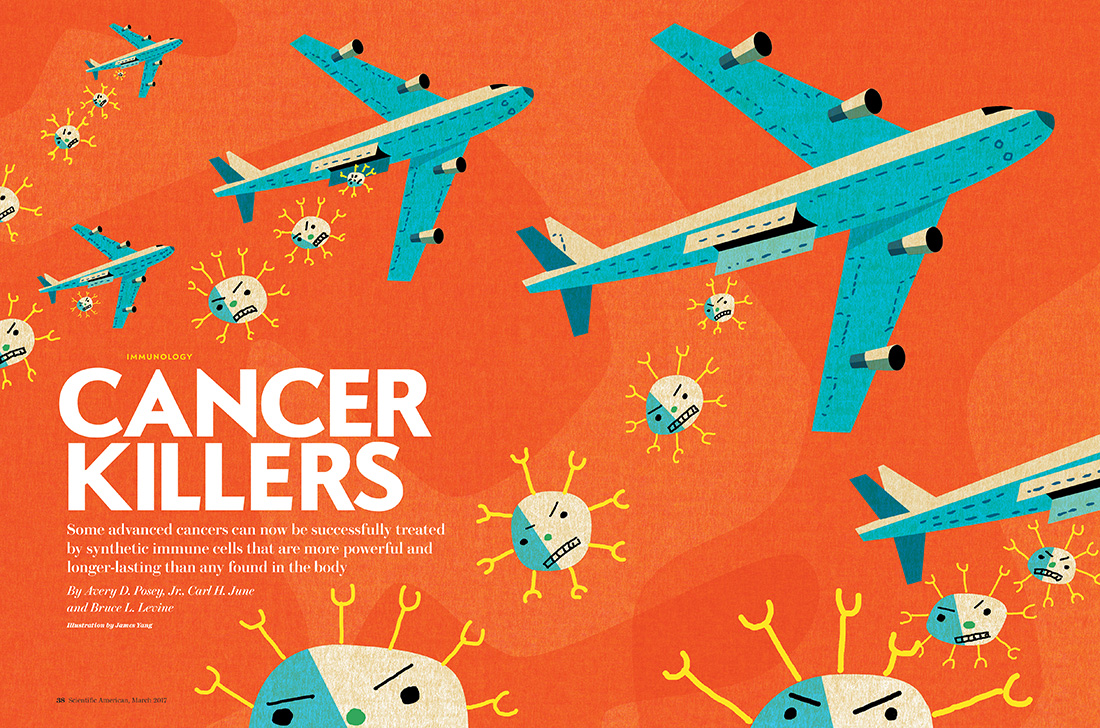 My father was a chemist so it’s always exciting whenever AD Michael Mrak calls with an assignment from Scientific American. The feature was about research to improve T-Cells abilities to fight cancer and become “super soldiers”. One of my favorite films in elementary school was an animated short which used soldiers as a metaphor for vaccines fighting the flu. It was meant to encourage us to not be afraid when getting shots. This was the perfect chance to mix a childhood memory with a great story.
