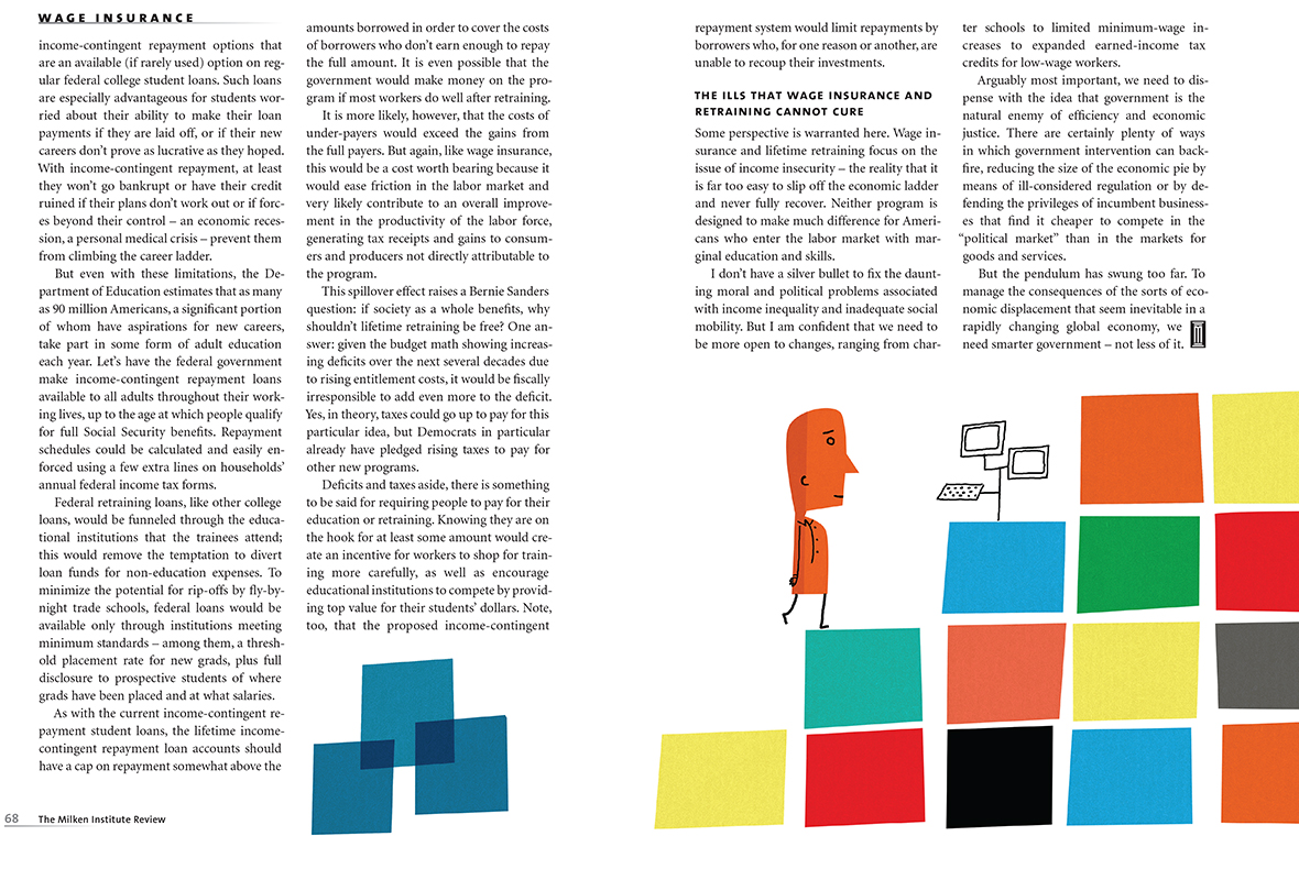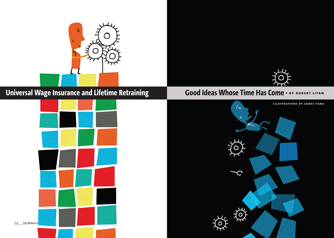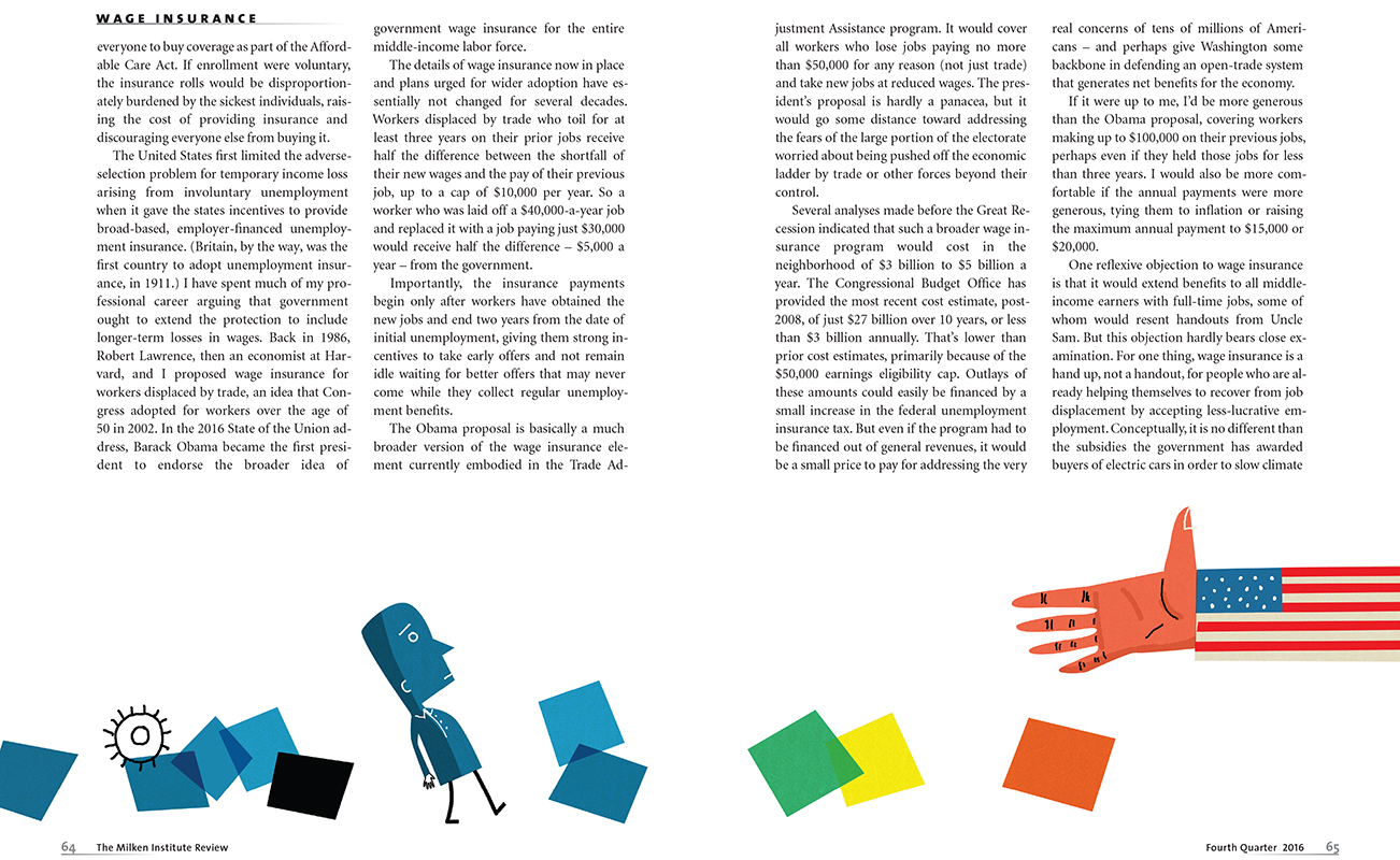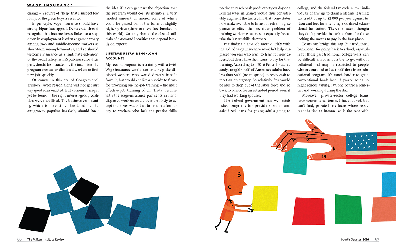 Series for Milken Review about universal wage insurance for workers who lose their jobs in the new world. AD Joannah Ralston allowed for my ideas to determine the layouts and we decided the metaphor of blocks could be used in a fun way to tell the story of destruction and rebuilding. While blocks may seem an obvious solution, there is always a way to show an idea with a different twist. This turned out to be one of the funnest projects of the year.