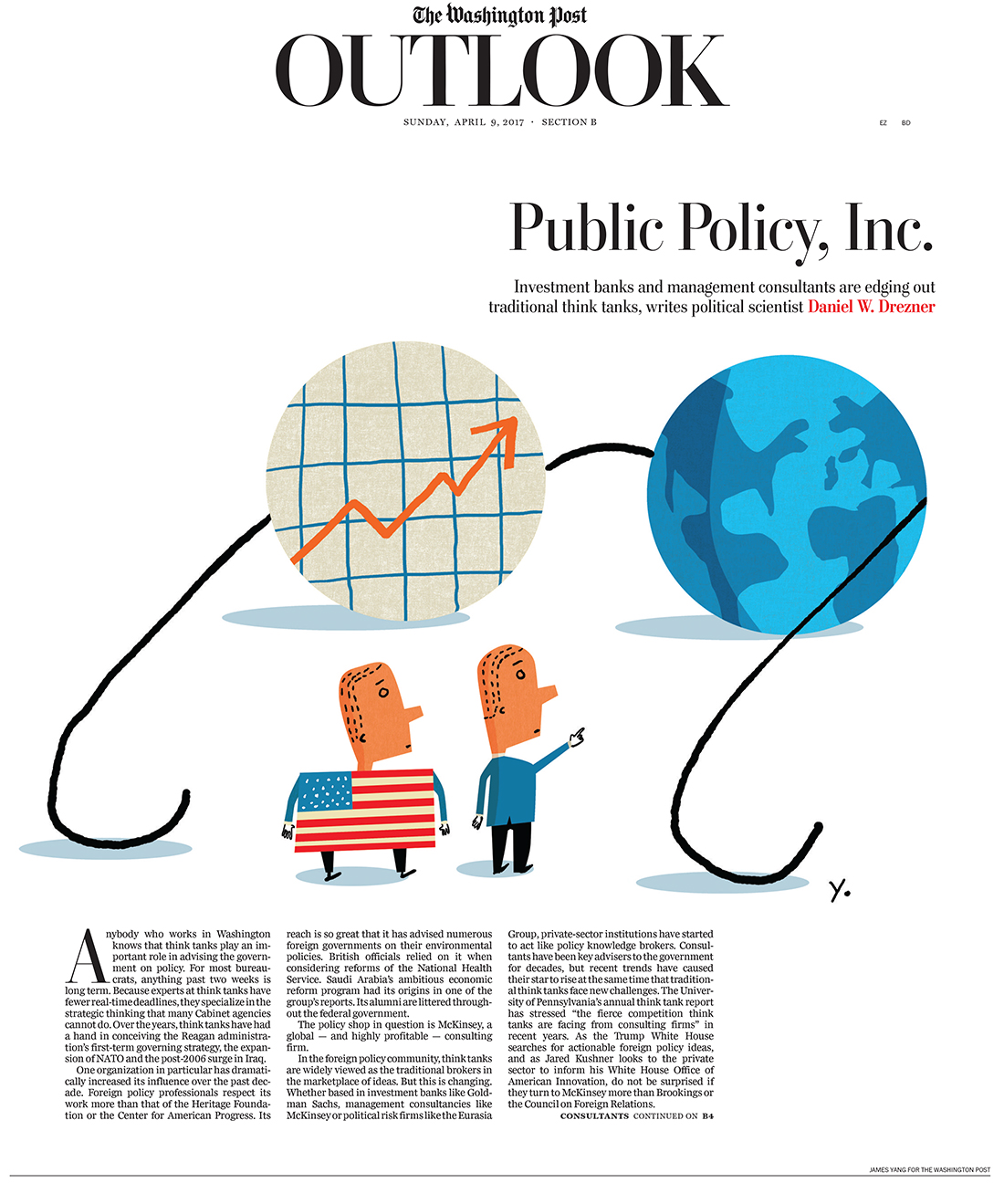The Washington Post has been on a tear lately and I was thrilled when AD Chris Rukan called with an assignment for the for the Outlook section. The story was about how policy making which used to be developed by think tanks is now being formed by for profit consulting firms or branches of larger corporations. The article focused on how a profit motive may skew analysis for government policy. Chris decides if the art needs a background after seeing sketches and we both agreed this idea would work best with white. It’s always exciting to work for one of the great papers.