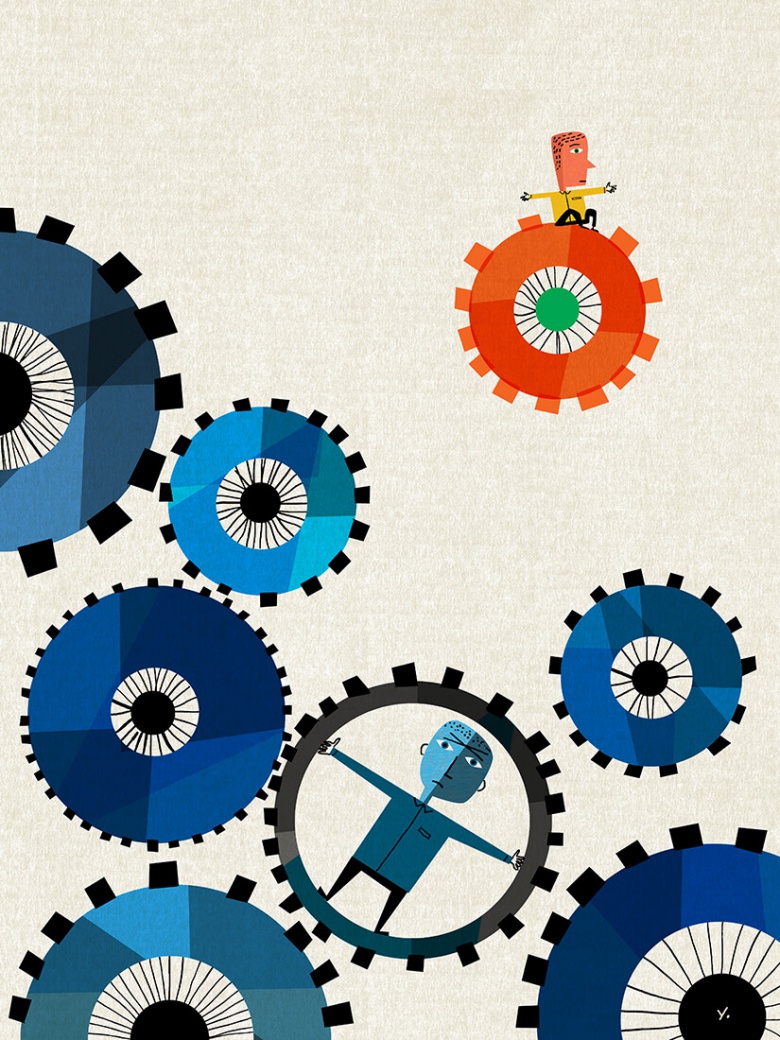 Kerry Prugh, AD for Notre Dame Magazine called with a project which I’m sure is near and dear to almost everyone’s heart: What does it take to be satisfied at work? Researchers were surprised to find money was not the highest priority, accomplishing something meaningful was the most important gage of worker satisfaction. Being a cog in the system turned out to be perfect image for feeling trapped or freed from the system. It was also immediately relatable on an emotional level. Who knew an assignment about being trapped at work would become one of my favorite assignments of the year?